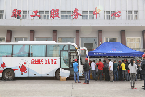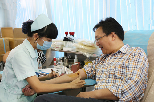 余董事長(zhǎng)在采血車上獻(xiàn)血