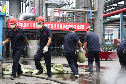工藝處置組用沙袋筑起圍堰防止廢液擴(kuò)散