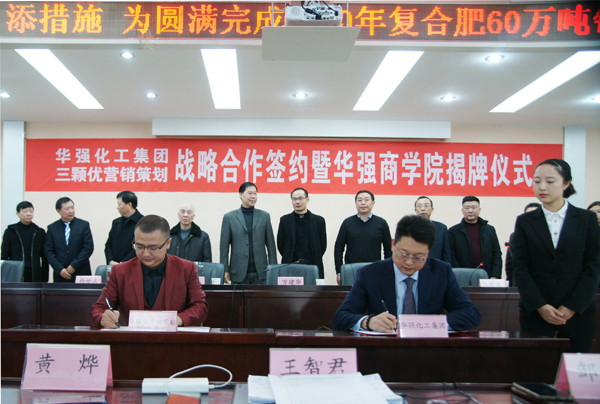 我公司副總經(jīng)理、銷售公司總經(jīng)理趙迎春和三顆優(yōu)營銷策劃公司總經(jīng)理王智君共同為“華強商學院”揭牌,并為王智君、謝磊、鄒剛、黃燁頒發(fā)“華強商學院”講師聘書,標志著“華強商學院”正式成立。隨后,營銷員代表國成龍和磷復肥分公司總經(jīng)理張華斌分別上臺表決心,表達了銷售公司堅決完成2020年銷售任務的決心。