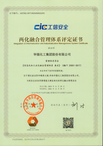 近日,我公司順利通過國家兩化融合管理體系評定認(rèn)證,并獲得兩化融合管理體系評定證書,成為符合 GB/T23001-2017 標(biāo)準(zhǔn)的國家級兩化融合管理體系貫標(biāo)企業(yè),標(biāo)志著華強(qiáng)化工在推進(jìn)“信息化和工業(yè)化”深度融合方面進(jìn)入了一個新的階段。